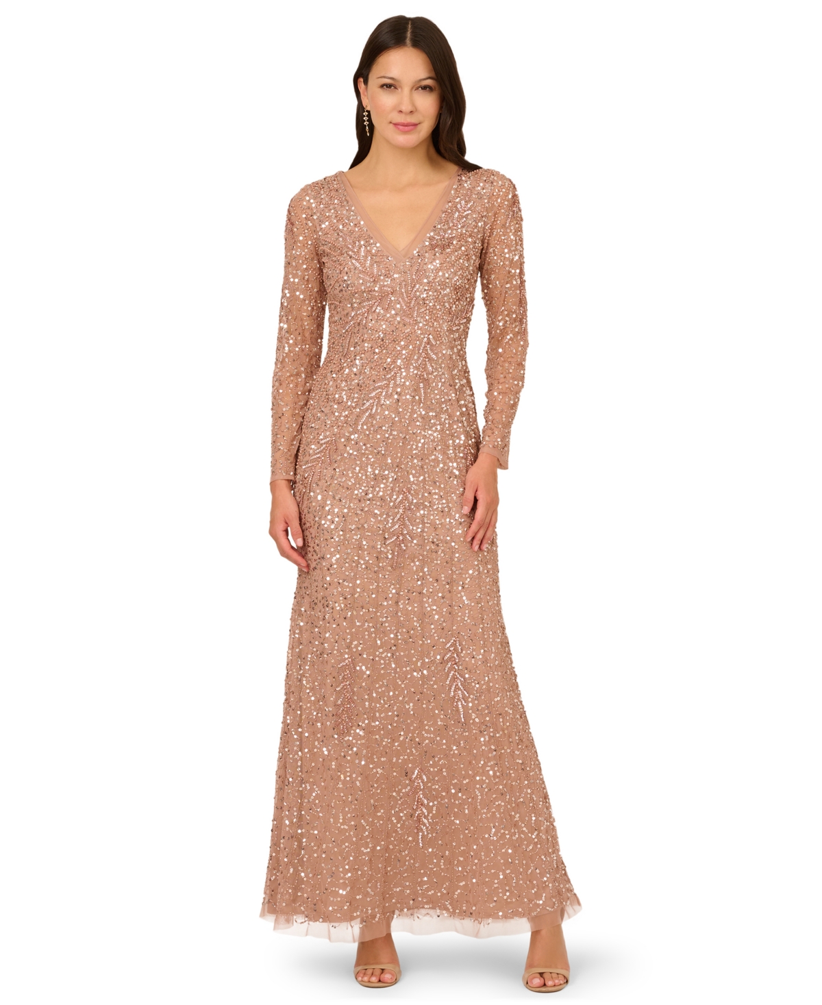 Adrianna Papell Women's Long-Sleeve Beaded Full-Length Gown