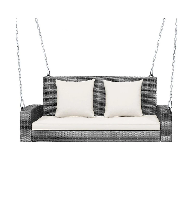 The 2-Person Patio Pe Wicker Hanging Porch Swing Bench, with an 800-pound weight capacity. Its large seat comfortably fits two people, while soft cushions and ergonomic armrests ensure coziness. Made of all-weather mix grey Pe rattan, it's durable.