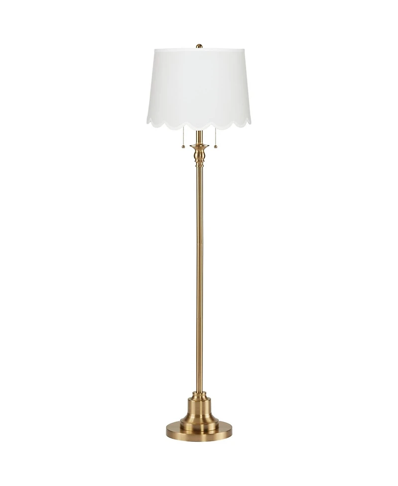 Create the living space of your dreams with the Dyna floor lamp, from the 360 Lighting brand. Perfect for homes blending contemporary and industrial styles, this antique brass finish floor lamp comes with a white fabric drum shade with a scallop pattern edge. Twin pull-chains easily operate two bulbs, bringing welcome illumination to your home.