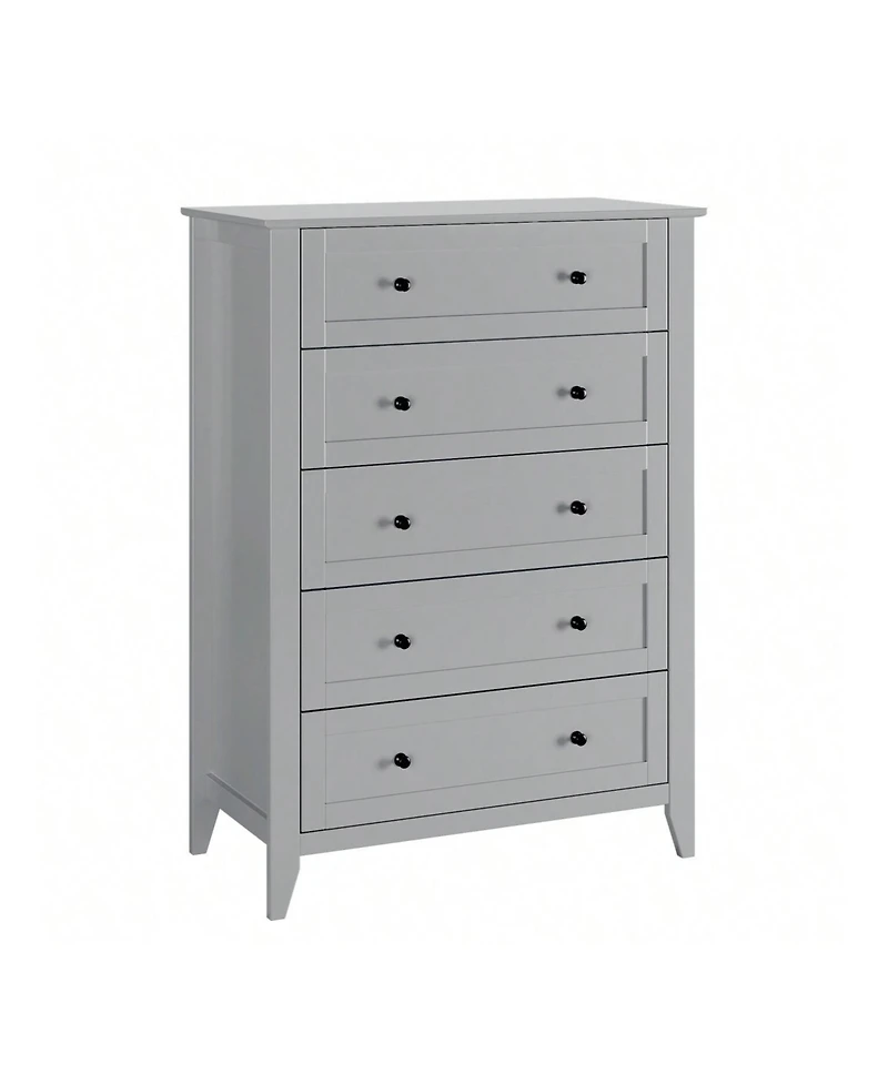 Modern 5 Chest of Drawer Dresser: Available in grey, white, and black, this modern tall nightstand features deep drawers and nickel round handles, serving as a wood organizer storage cabinet for any bedroom or living room.