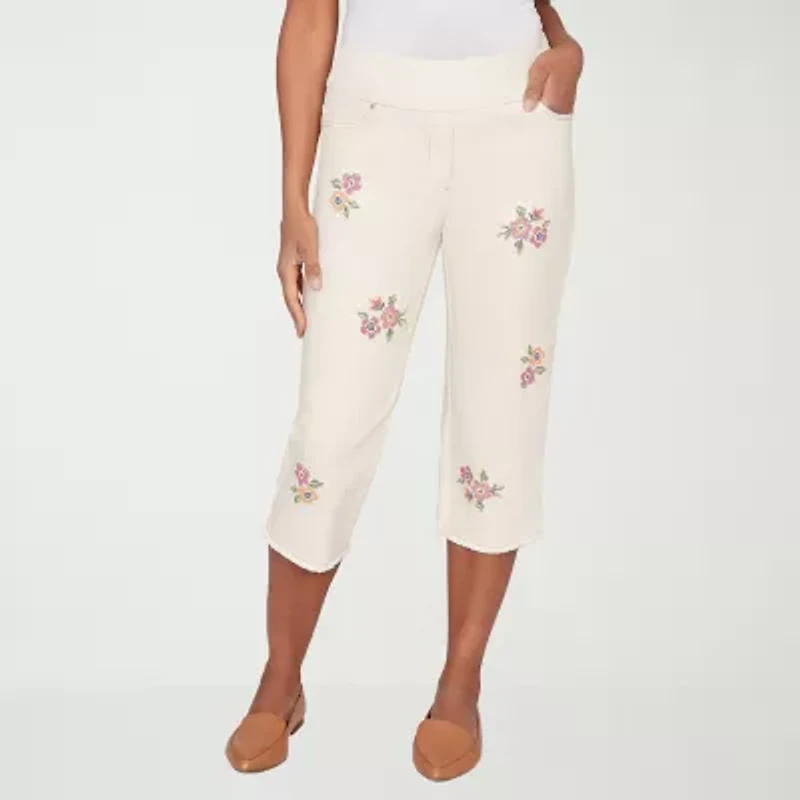 These Alfred Dunner women's capri pants are a pretty peasant inspired edition for your warm-weather wardrobe. Made from stretch-cotton, this straight-leg pair has a comfortable pull-on elastic waistband, embroidered flowers and cropped hems with frayed edges. Wear them with a blouse or tee.