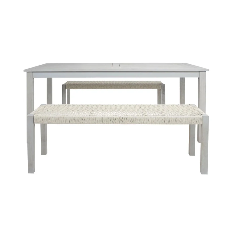 Classic construction is given a contemporary update in this outdoor Aquina Dining Set. Aquina s Parsons style frames are tropically transformed with the woven rattan on its two benches, making for hours of comfortable conversation beneath the stars or in the sunshine. Includes dining table.