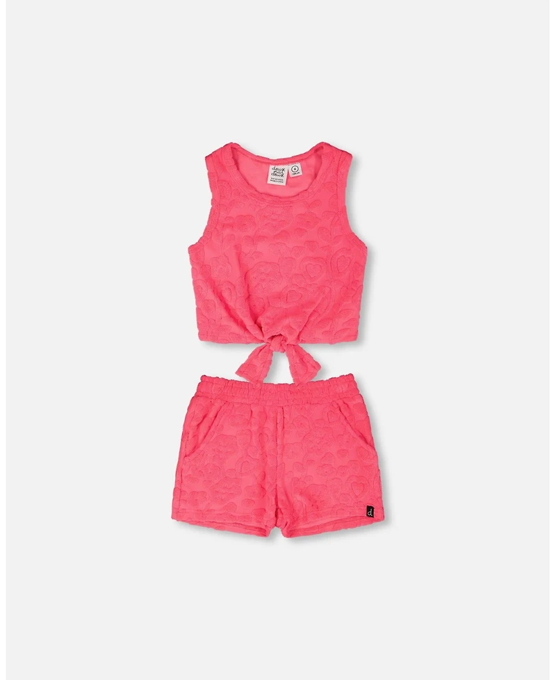 The terry tank top with shorts set in pink is a cheerful and comfy duo for sunny days. The sleeveless tank features a front tie detail, while the matching shorts come with scoop pockets and an elastic waistband for easy wear. Made from soft terry with a hint of stretch, this playful set from our “Like A Fish To Water” collection is perfect for active summer fun.