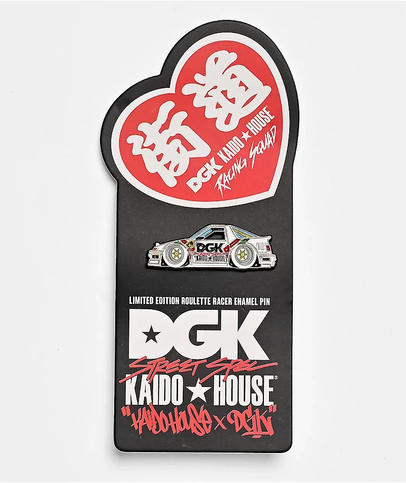 DGK teams up with Kaido House to present the Torque enamel pin. The metal pin showcases a car bearing dual branding, perfect for adding a touch of motorsport style to any outfit or bag.