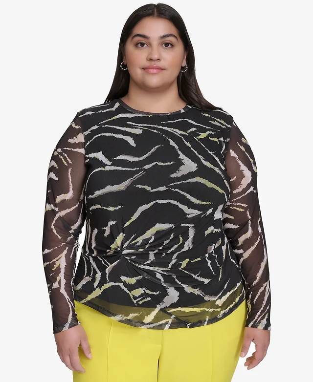 Dkny Plus Printed Mesh Long-Sleeve Top