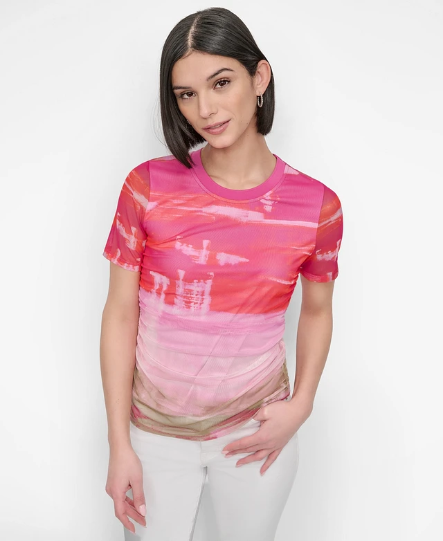 Dkny Women's Printed Mesh Crewneck Ruched Top