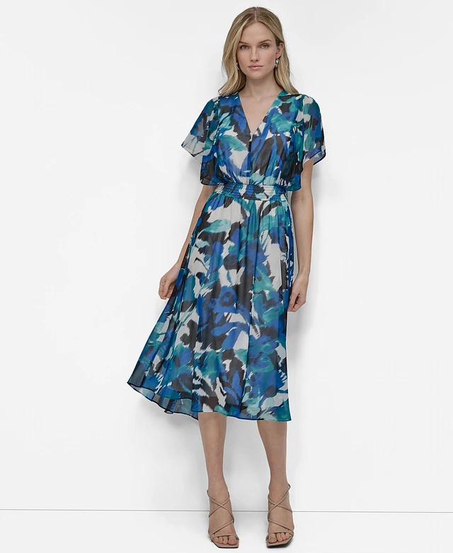 Dkny Women's V-Neck Smocked-Waist Flutter-Sleeve Midi Dress