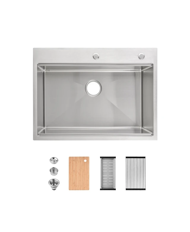 Busdays Stainless Steel Kitchen Sink, 33x22 Single Bowl, Overmount Handmade Sink in Brushed, with Cutting Board, Colander, Grid, Ls-SSBR01