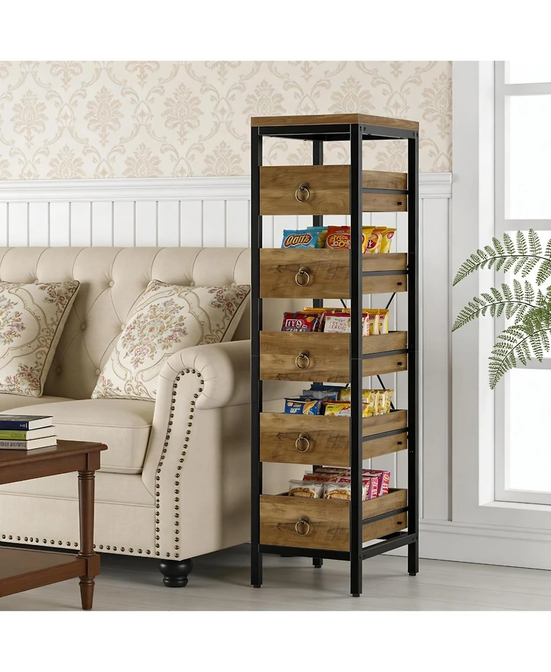 Store snacks and produce efficiently with this narrow 5-tier fruit and vegetable storage rack in brown, featuring pull-out baskets for easy access and organization.