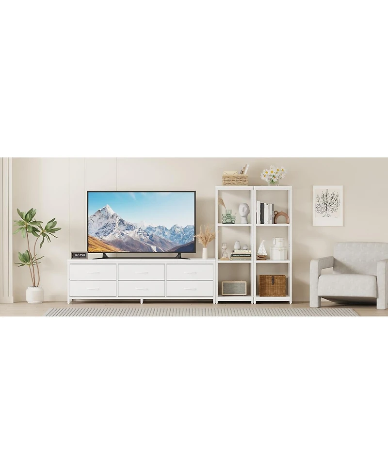 Description:88.9"" Tv stand brings storage and display space together in a clean, modern design. It fits Tvs up to 75"" and helps keep your living room tidy with fabric drawers and open shelves.Features:- Two 4-tier shelf units can be arranged together or apart- Fabric drawers help organize remotes, books, and daily essentials- Metal frame and engineered wood create a steady media console baseSpecifications:Color: Black, WhiteSize: 88.9""TV Fit: Up to 75""Style: Tv Stand, Entertainment Center, Media Console