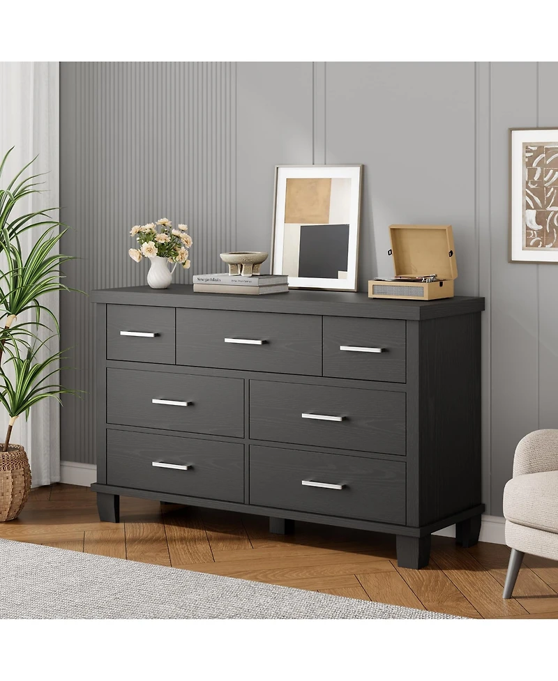 DescriptionBring order and style to your home with this 7 drawer dresser, designed for bedrooms, living rooms, closets, entryways, and nurseriesIts clean lines, metal handles, and versatile finish create a modern look that blends easily with many room stylesFeatures7 drawers include 2 small drawers and 5 large drawers for flexible storageEngineered wood build with a smooth finish and easy pull metal handlesWooden legs, one adjustable center leg, and an anti tip feature support steady everyday useSpecificationsColor: Black, White, Wood GrayDrawer Count: 7Style: Modern minimalistSuggested Use: Bedroom, Living Room, Closet, Entryway, Nursery