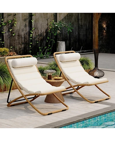 Rainsken 2-Piece Foldable Rattan Lounge Chair Set, Outdoor Reclining Chair with Adjustable Backrest, Thick Cushion and Removable Headrest for Beach