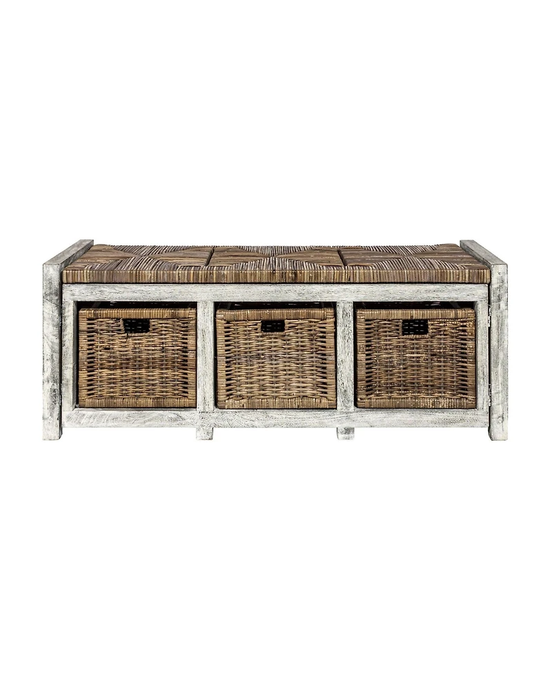 Distressed gray paint and natural wicker panels give this storage bench a relaxed farmhouse or coastal vibe. Three fabric-lined wicker baskets keep your entry, bedroom, bathroom or den neatly organized. The 43.3" length is just right for a bed bench.