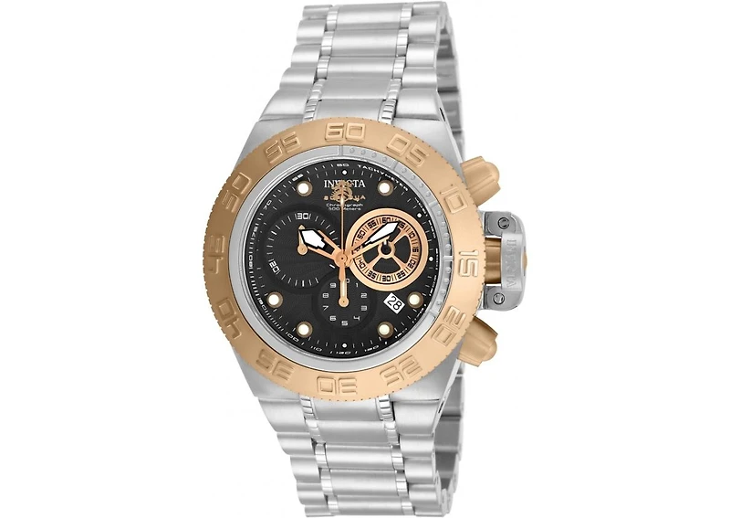 This impressive Invicta Subaqua watch features a precise Quartz movement as well as a rose gold case. Its black, metal dial is enclosed by a highly protective Flame Fusion Crystal. This watch is finished by a strong steel, stainless steel band, and it offers 500 m water resistance. Led with expert engineering, no feat or occasion will ever be too great for Invicta's Subaqua to handle. The sheer magnitude of this mighty timepiece is superbly executed with surgical-grade stainless steel, Swiss movements and multiple color options of ionic plating. Managing up to 500 meters of water, finished off with a unidirectional rotating bezel, and integrated shock resistance- the Invicta Subaqua is the diver definitive in negotiating any adventure by land or by sea. From its founding in 1837 to the present day, innovative excellence has been at the core of each collection throughout the history of Invicta.