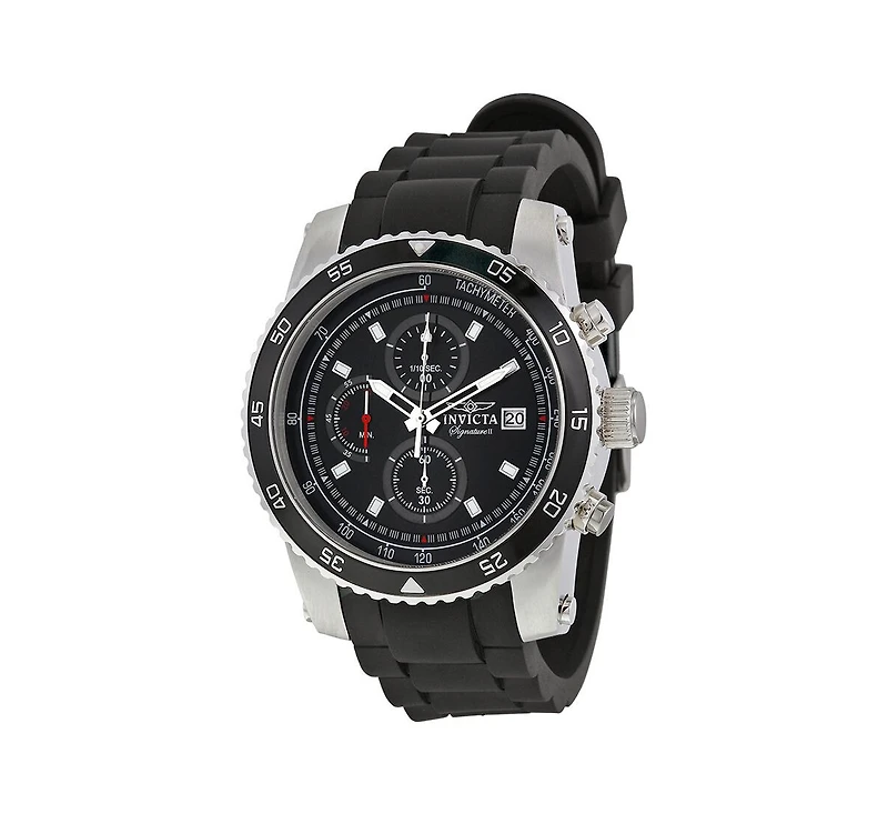 Stainless steel case with a black rubber strap. Uni-directional rotating stainless steel bezel with a black Pvd ring. Black dial with luminous silver-tone hands and index hour markers. Minute markers. Tachymeter around the outer rim. Dial Type: Analog. Luminescent hands and markers. Date display at the 3 o'clock position. Chronograph - three sub-dials displaying: 60 second, 60 minute and 1/10th of a second. Caliber 5050.E2 quartz movement. Scratch resistant flame fusion crystal. Pull / push crown. Solid case back. Round case shape. Case size: 45 mm. Case thickness: 12 mm. Band width: 22 mm. Tang clasp. Water resistant at 50 meters / 165 feet. Functions: chronograph, date, hour, minute, second. Additional Info: this watch comes with an extra strap. Casual watch style. Invicta Signature Ii Chronograph Black Dial Men's Watch 7452.