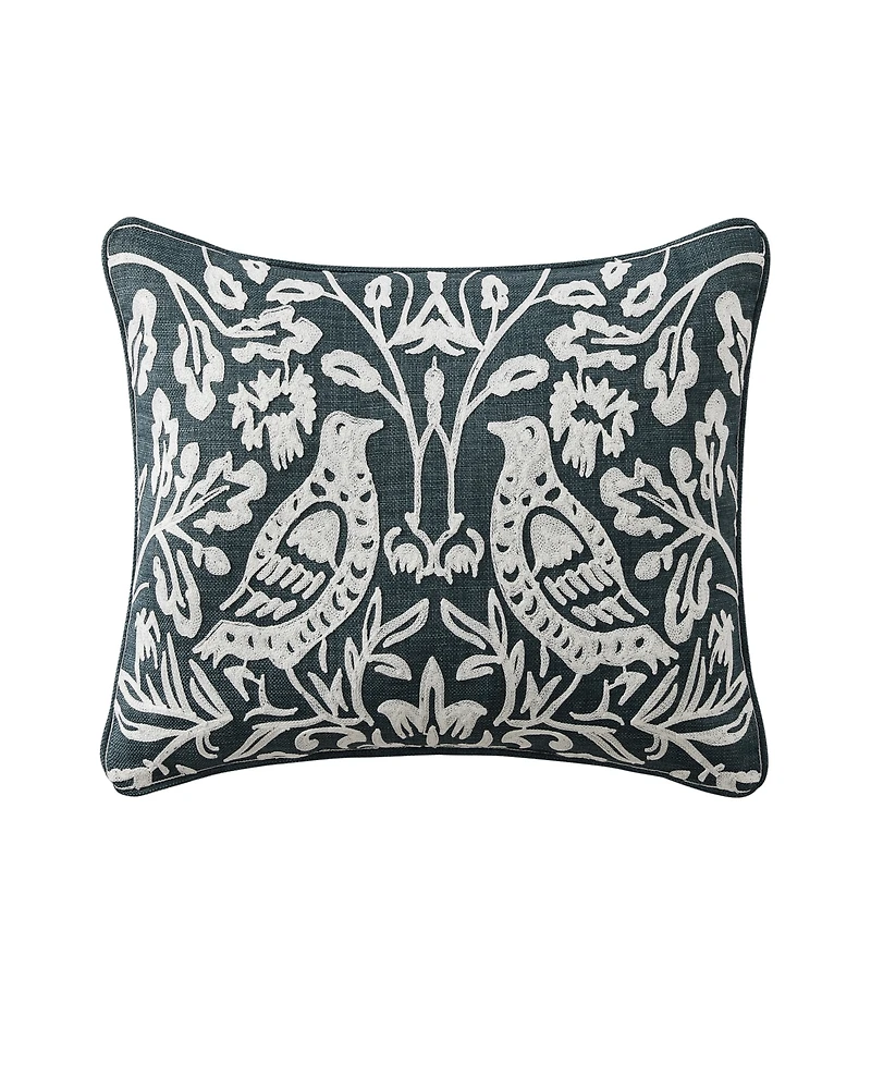 The blossom view boudoir throw pillow features an embroidered chinoiserie technique with lovely playful birds in a serene garden scene. This cheerful pillow adds a whimsical touch to charm your bedroom decor. Pair this luxury accent pillow with the blossom view ensemble to complete your bedroom serenity.