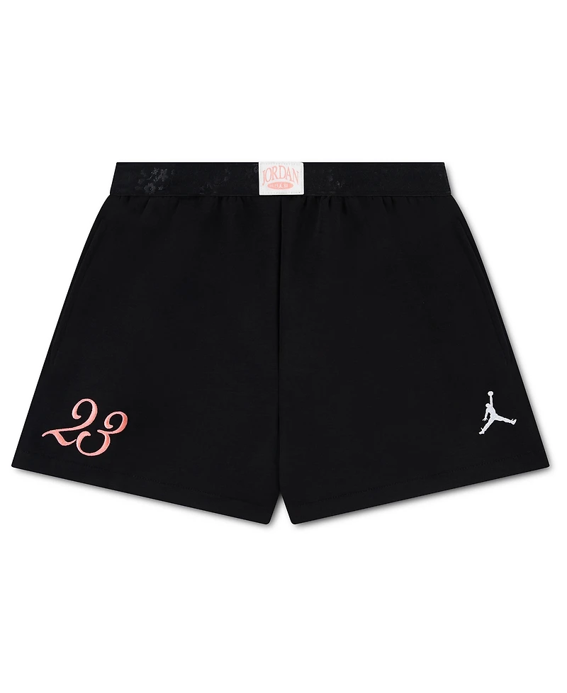 Bring sporty style to her outfit with these Jordan Flower of Friendship shorts, crafted from smooth, stretchy knit fabric for easy movement. Featuring logo embroidery, a floral-detail elastic waistband, and side pockets, they're suitable for pairing with matching tops for a fun, coordinated look.