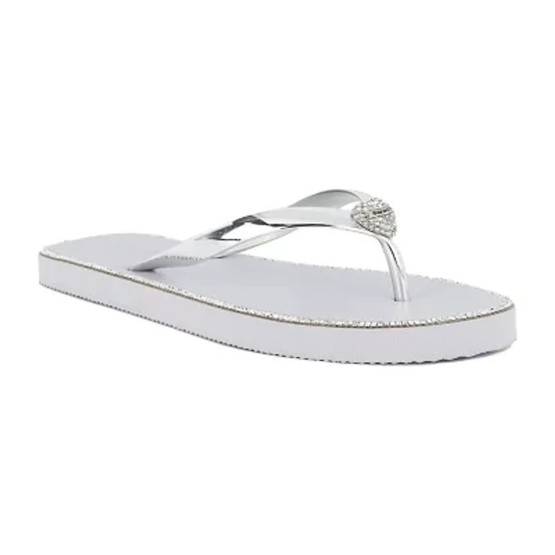 The Selfless flip flops by Juicy Couture are comfortable and detailed with an ornamental heart for added bling. These easy to slip on flip-flops feature a round toe and bling accents.