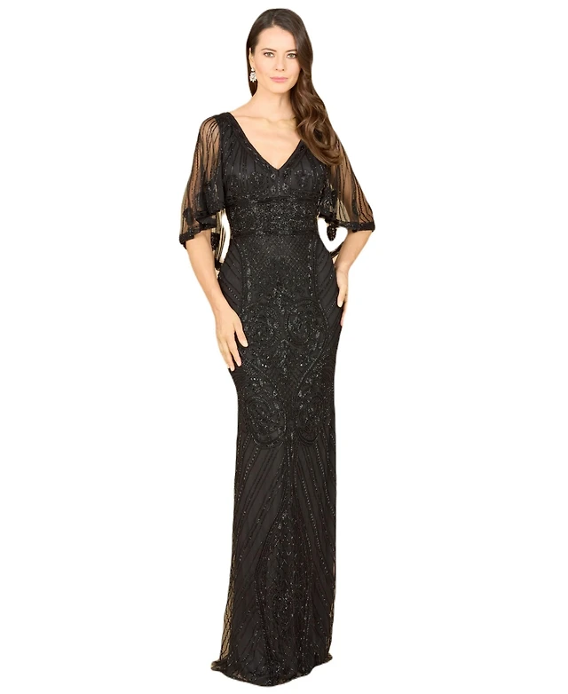 Lara Women's Cape Sleeve V-Neck Beaded Gown