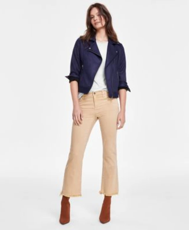 Liverpool Los Angeles Womens Faux Suede Moto Jacket Sleeveless Boatneck Top Hannah Frayed Cropped Flare Jeans