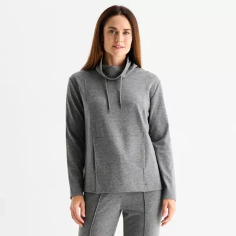 The Liz Claiborne women's tunic top offers a sleek, athleisure look and feel. Designed with a cowl neckline and long sleeves, it is crafted from soft double-knit jersey fabric. It works well with jeans or pants for a chic off-duty look.