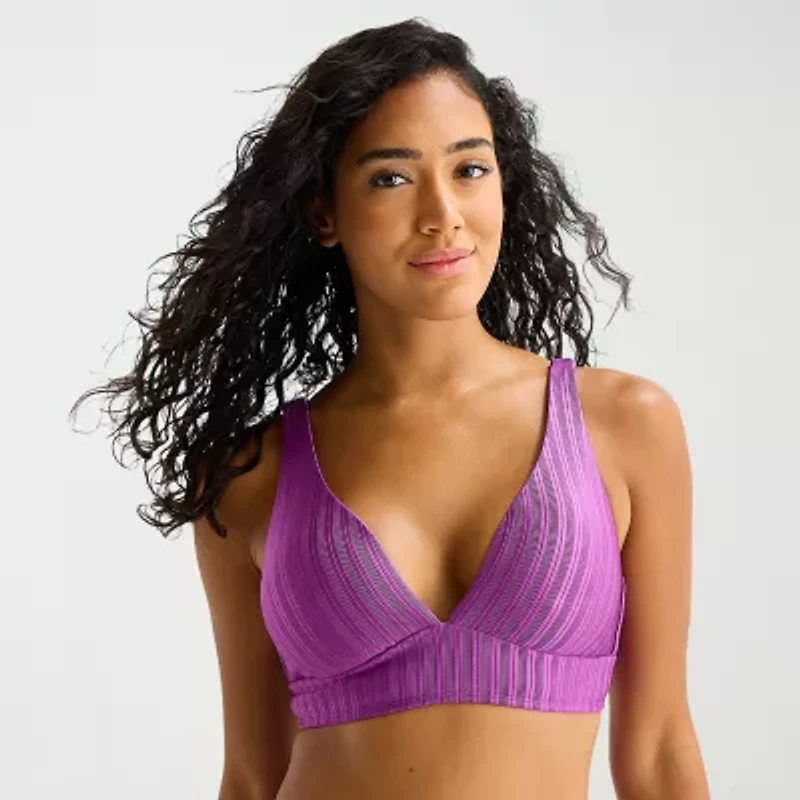 Designed with a textured striped design and a full lining, this women's stretch-knit bikini swimsuit top by Mynah has a V-neckline, removable cups, and adjustable shoulder straps with a back tie. Wear yours with the matching swim bottoms and sunglasses.