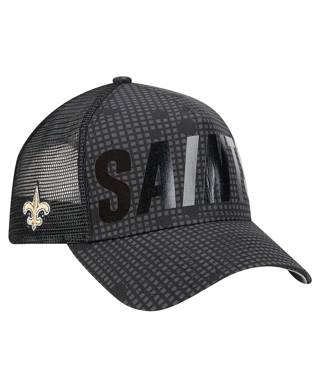 New Era Men's Black New Orleans Saints Midnight Ink Tonal Text A-Frame Trucker 9FORTY Adjustable Hat