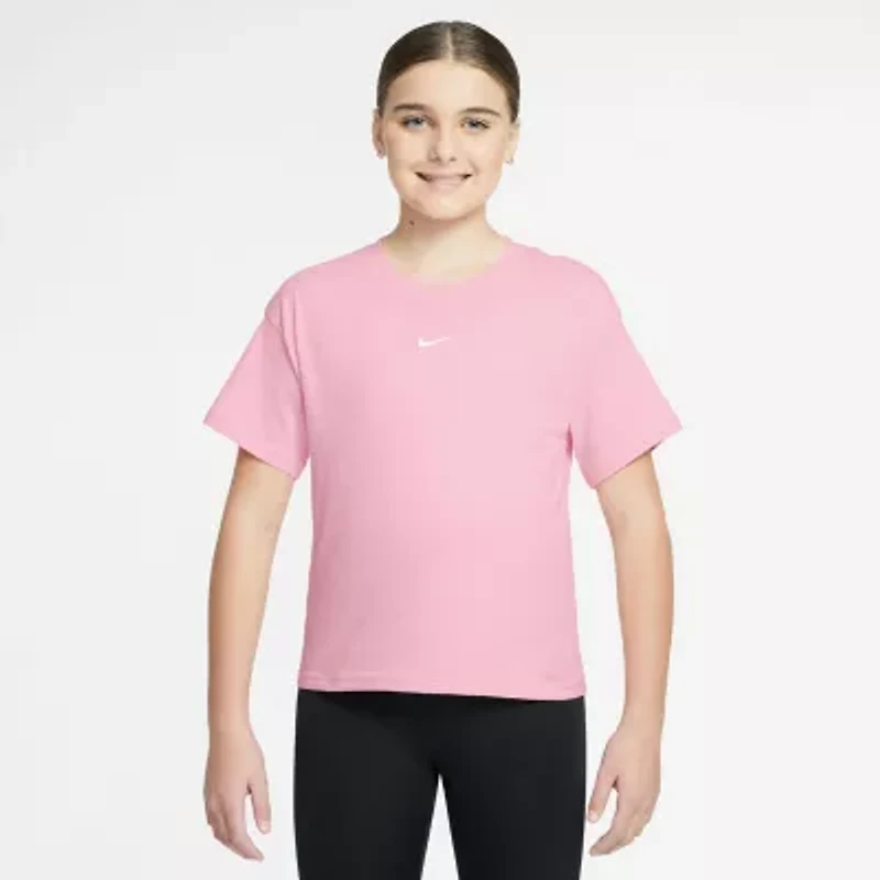 Nike Sportswear Essential Big Kids' (Girls') T-Shirt. Soft cotton and a roomy fit help make this tee an essential pick for everyday wear. Slightly dropped shoulders and a little extra space in the body give you a comfortable feel without being too big or too long. Embroidered Swoosh logo.
