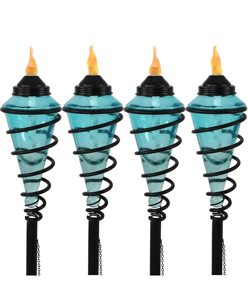 This set of 4 torches features beautiful, colored glass vessels that are attractively illuminated by torch light. The torches are surrounded by a metal casing that swirls elegantly for a contemporary look. Plus, this set of torches includes four fiberglass wicks that burn longer than regular wicks to keep the lights burning even after the sun sets. The fuel containers can be filled with torch or bio ethanol fuel (please note, this set of torches does not come with fuel fuel must be purchased separately). Safely extinguish the flame on each torch with the included snuffers which are conveniently attached to each torch by a chain. The set also includes ground stakes and deck clamps providing the option to use them in the yard or on the deck rails.