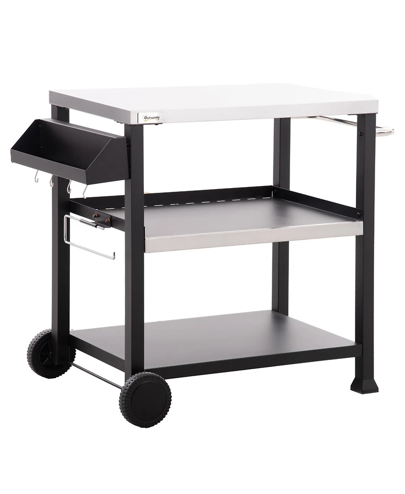 Whether you want a mobile place to put a pizza oven, an outdoor prep station or extra space as you grill an Outsunny outdoor grill cart can do it. It has a large stainless steel surface that wipes clean and space for food, plates, or cleaning supplies below. 4 hooks hold utensils. There's a spice rack for seasonings, a spot for paper towels, and trash bags, so everything can be done in a single spot. Whatever you want to make mobile outside, this outdoor grill table can. Get out, with Outsunny.