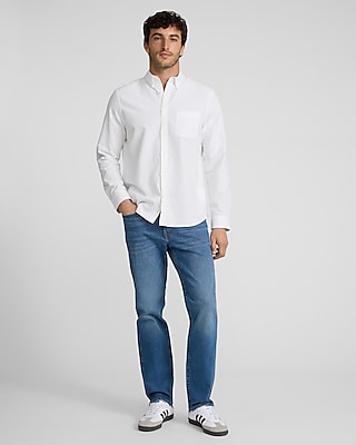 Slim through the thigh and straight through the leg, these medium wash jeans have just enough stretch for a lived-in feel. They feature a one button closure, zip fly, belt loops, and traditional five pocket styling.