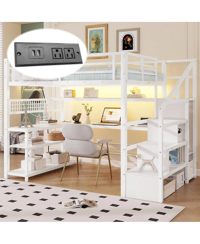 Streamdale Furniture Metal Loft Bed w/Stairs, Desk, Storage, Lights, Charge Station