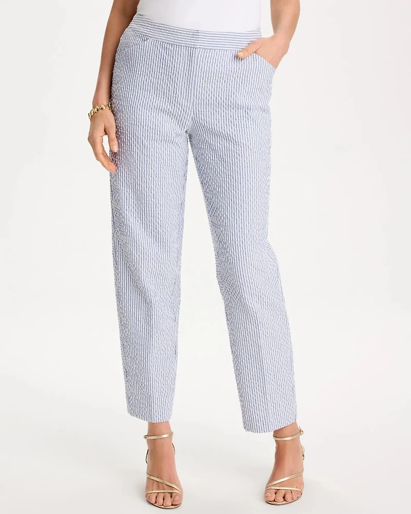 A modernized, ancient tradition made by Chico's — these classic woven Seersucker Straight Ankle Pants showcase a striped motif, smoothing comfort pull-on waistband, and hook and bar closure.
