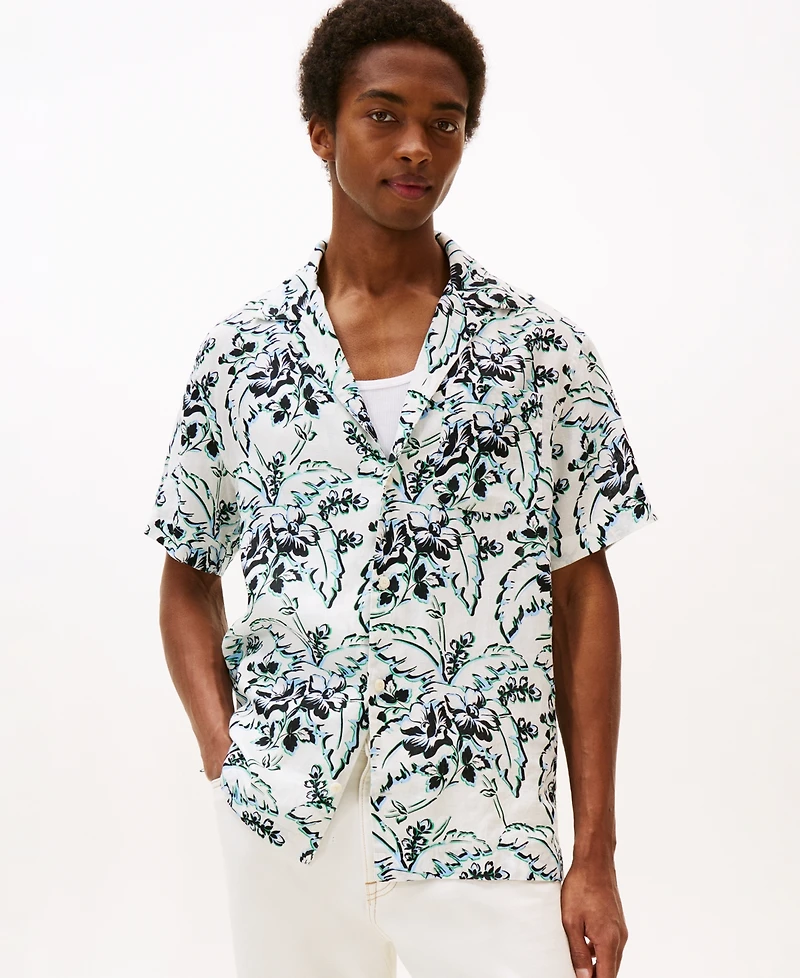 Tommy Hilfiger Men's Patterned Linen Button Up Short Sleeve Shirt