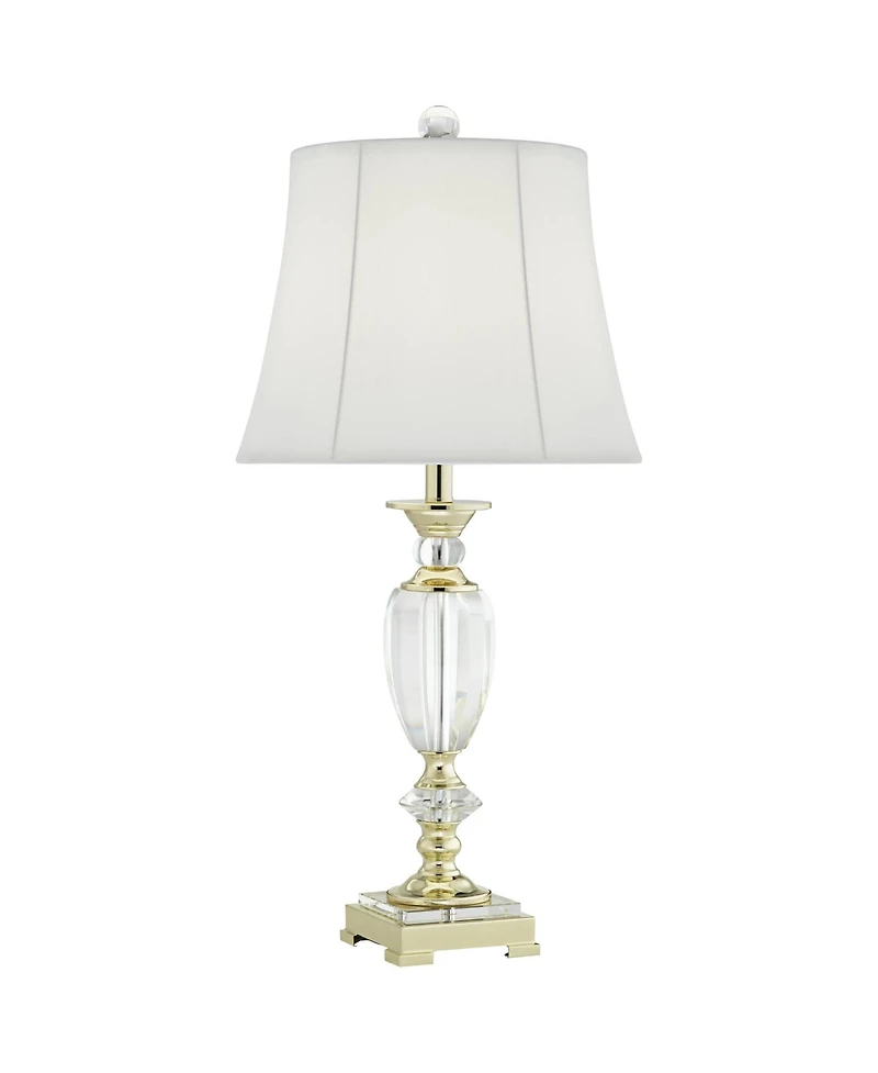 This urn shape faceted crystal Bixby table lamp, from the Vienna Full Spectrum brand, features brass finish accents that create an eye-catching effect. A footed stand in brass holds this elegant design topped with a sphere finial and white fabric bell shade. From the Vienna Full Spectrum crystal lighting collection. This lamp comes with a tabletop dimmer, which allows you to control the level of lighting. Simply insert the lamp plug into the dimmer outlet, and then slide the switch on the control to dim or brighten the lighting. Dimmer is compatible with halogen and incandescent bulbs, and most dimmable Cfl and Led bulb designs.