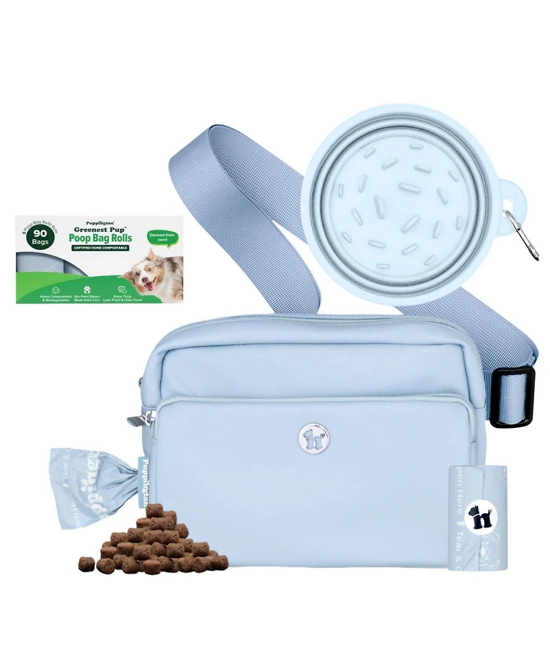 Tired ""of juggling treats, tangled gear, and messy cleanups? The Puppington 3-in-1 Crossbody Bag and Treat Pouch Bundle solves every pet parent s biggest pain points when leaving home with a dog in a smart, stylish design that makes outings a breeze.Hands-free and water-resistant, this bag features an easy-clean treat pocket, built-in poop bag dispenser with matching compostable bags, and a clip to keep full bags off your hands. It fits your phone, keys, leash, and more, effortlessly going from office to off-leash. Wear it three ways: crossbody, shoulder bag, or fanny pack.This bundle includes 7 rolls of matching, planet-friendly poop bags made from corn and certified for both home and industrial composting with one roll preloaded in the dispenser. Also included: a Bpa-free, collapsible Slow Feeder Travel Bowl with a no-slip base for cleaner, healthier mealtimes on the go.Say goodbye to chaos and hello to walk-day wins with sustainability, convenience, and elevated style all in one.""