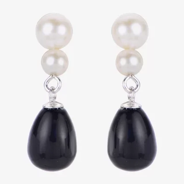 Womens Black Onyx Cultured Freshwater Pearl Sterling Silver Drop Earrings