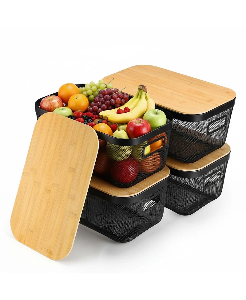 Metal Mesh Steel Basket Set: this set includes 4 metal mesh baskets and 4 matching lids, adding a neat, functional touch to your space. Space-saving Stackable Design: the metal mesh steel baskets stack easily (with lids, total height fits tight spaces), saving floor space by 40%-well-suited for small kitchens or apartments. Ventilated Fresh-keeping Structure: open mesh prevents buildup, keeping produce fresh three times longer than plastic containers lids block light to slow sprouting, reducing food waste. Easy to Carry: each metal mesh steel basket has hollow handles for easy transport-move them from shelves to cabinets smoothly Wipe the metal mesh and lids with a damp cloth for quick care. Versatile Storage for Multiple Spaces: use for fruits, toys, toiletries, or craft supplies Works in kitchens, bathrooms, dorms, or RVs-ideal for any area needing extra organized space.