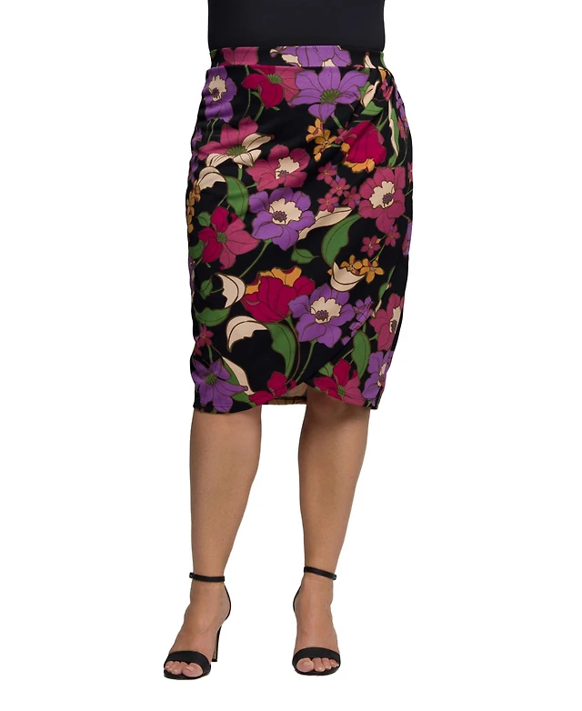 24seven Comfort Apparel Plus Black Multi Floral Print Midi Pencil Skirt