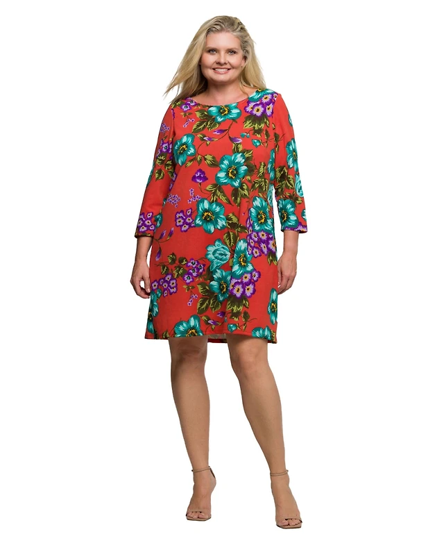 24seven Comfort Apparel Plus Orange Floral Print Three Quarter Sleeve A Line Knee Length Dress