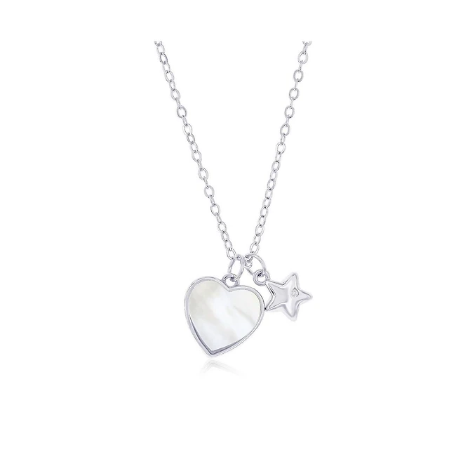 Sterling Silver Mop Heart & Star Cz Necklace
