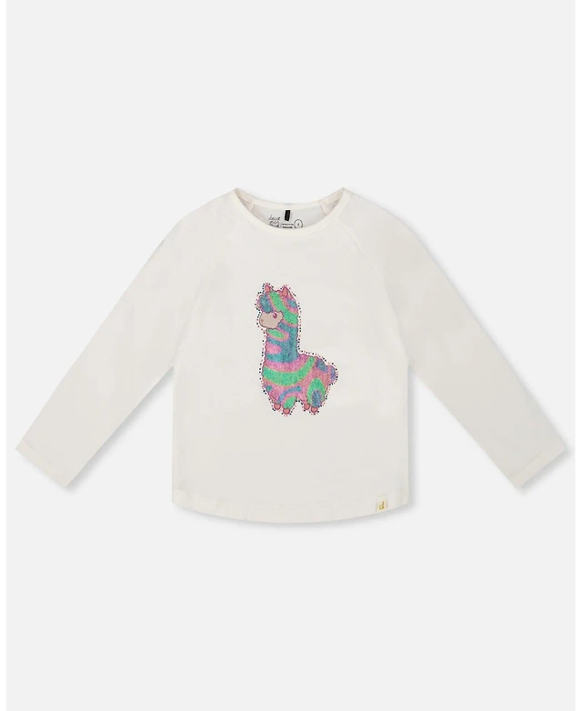 Deux par Deux Girl Cotton T-Shirt Off White with Llama - Child