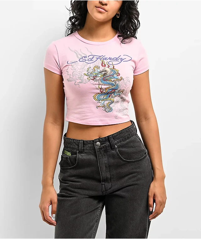 Ed Hardy Koi Rhinestone Pink Crop T-Shirt