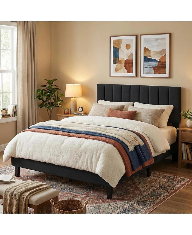 gaomon Full Upholstered Velvet Platform Bed with Two Tone Scalloped Headboard and Solid Wood Slats