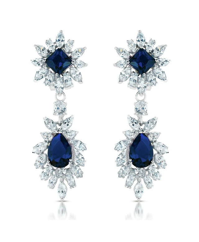 Sterling Silver White Gold Plating with Blue Cubic Zirconia Drop Earrings