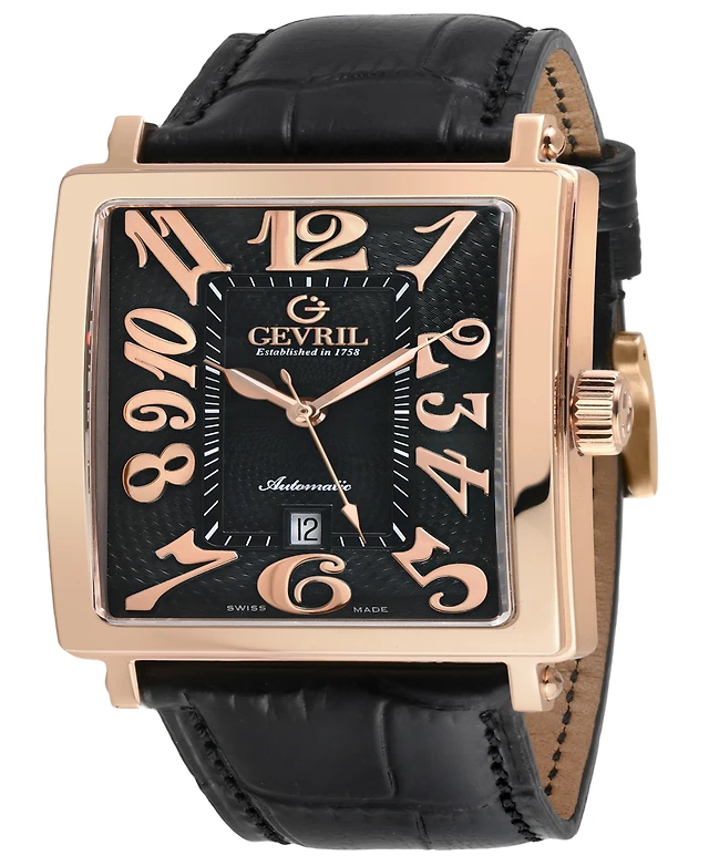 Gevril Men's Avenue of Americas Swiss Automatic Italian Black Leather Strap Watch 44mm