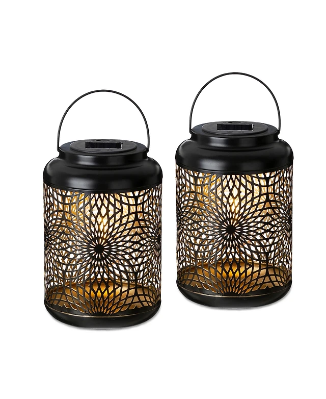 Glitzhome 14.25" H Set of 2 Metal Cutout Flower Pattern Solar Powered Led Outdoor Lantern with Stand