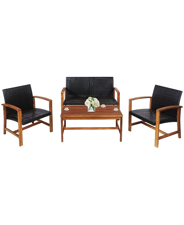 Gymax 4 Pieces Conversation Set Acacia Wood Loveseat Chair & Table for Patio