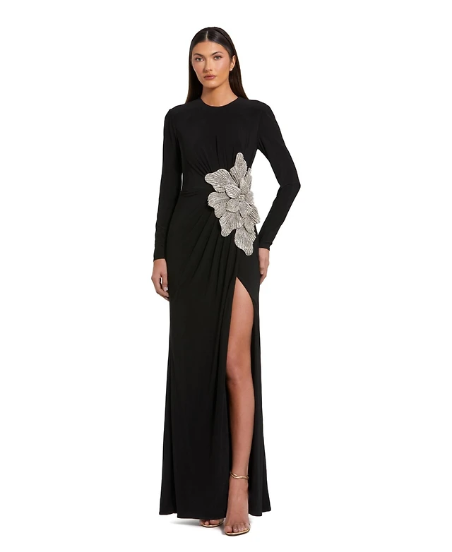 Mac Duggal Women's Long Sleeve Fitted Jersey Gown With 3D Flowers