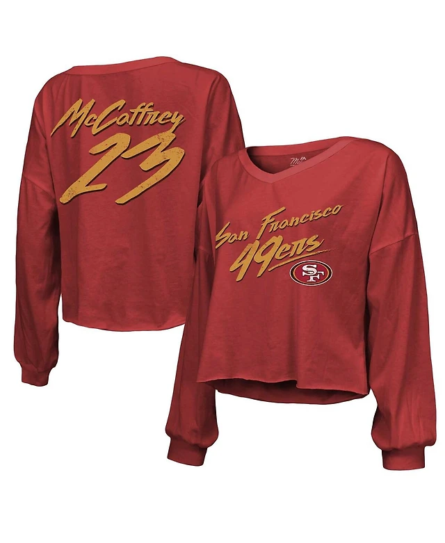 Women's Majestic Threads Christian McCaffrey Scarlet San Francisco 49ers Name and Number Off-Shoulder Script Cropped Long Sleeve V-Neck T-shirt